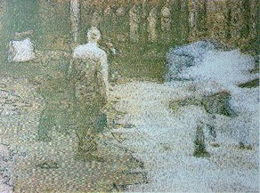 Fotografische Vorlagen verfremde ich am Computer und drucke diese im Siebdruck