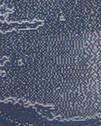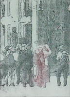 Das ist ein stark vergrösserter Ausschnitt der Radierplatte. Das Bild entstand wie beim Siebdruck am Computer. Als Kopierfilm stellte ich einen schwarz-weiß Negativfilm her, indem ich mit dem Tintenstrahdrucker auf eine Klarsichtfolie druckte. Die Zinkplatte wird mit der lichtempfindlichen Schicht besprüht und gleichmässig durch die Benutzung eines alten Plattenspielers auf der Zinklatte gleichmässig verteilt. Der Entwickler wäscht nach dem Kopieren auf die Zinkplatte die Kopierschicht der UV belichteten Stellen heraus, die unbelichteten Stellen bleiben säurefest. Nach der Entwicklung wird die Zinkplatte in ein Säurebad getaucht und bis zu einer für die Radierung notwendigen Tiefe geätzt. Dann beginnt der normale Radiervorgang. |